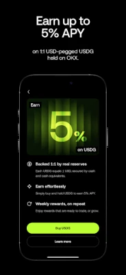 ● Money never sleeps with crypto staking. Earn up to 5% APY on 1:1 USD-pegged USDG held on OKX.